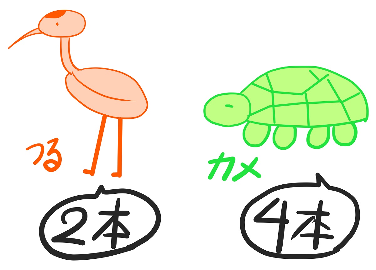 ところで、つるとカメってそれぞれ足の数は分かるかな?つるは2本、カメは4本だね。